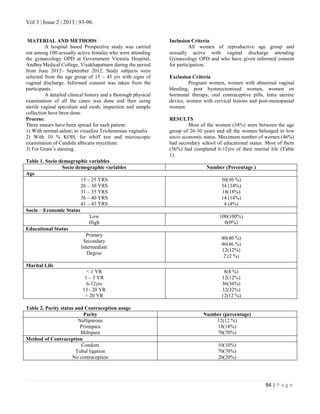 This study evaluated the various causes of leucorrhea in 100 sexually active females aged 15-45 years in India. Candida was found to be the most common cause of leucorrhea (24% of cases), followed by bacterial vaginosis (20% of cases). Trichomoniasis was found in 8% of cases. No cause was found for 48% of cases, likely representing physiological discharge. Maintaining proper perineal hygiene and using condoms were recommended to reduce prevalence of infectious leucorrhea and reproductive tract infections.