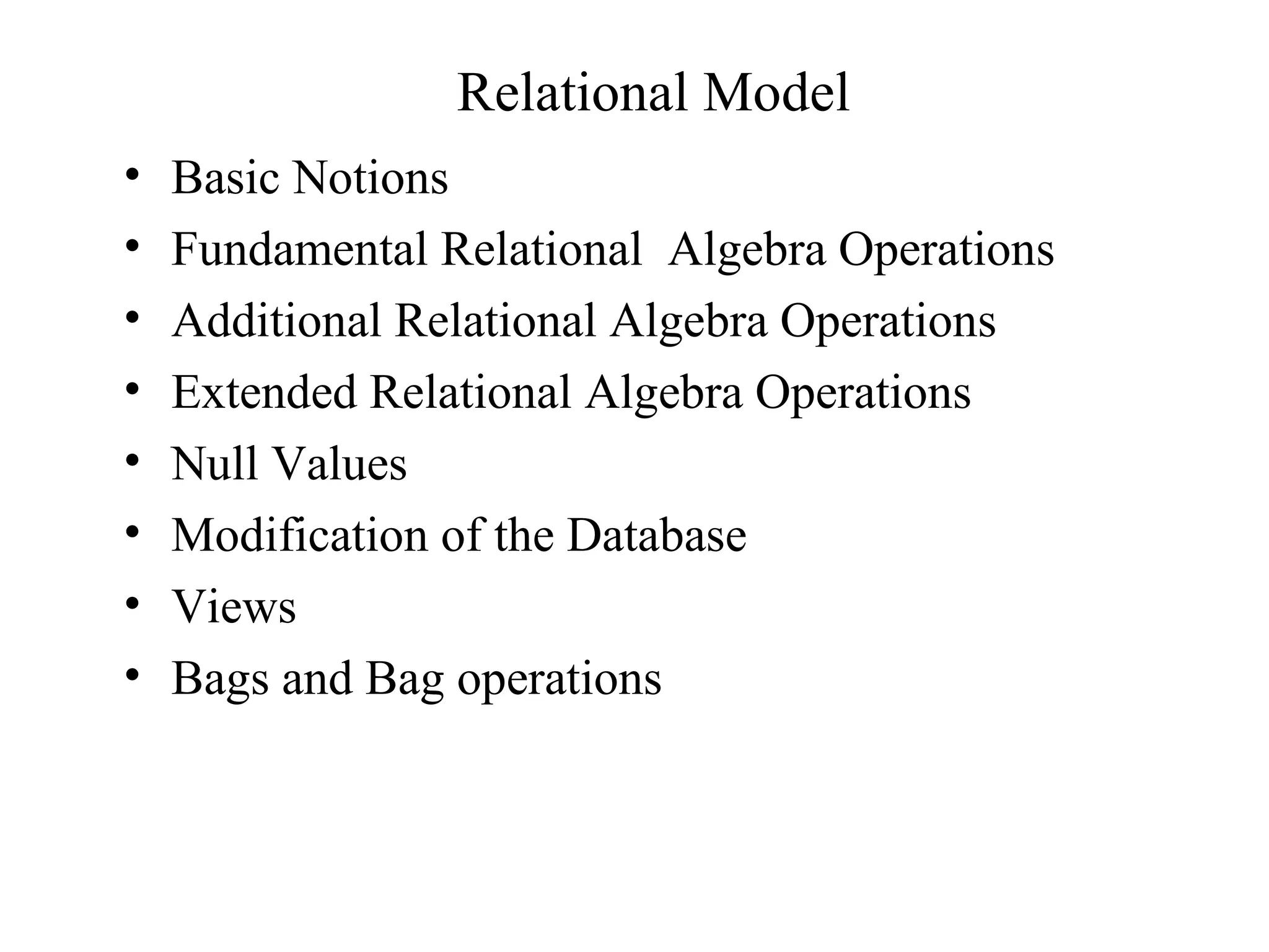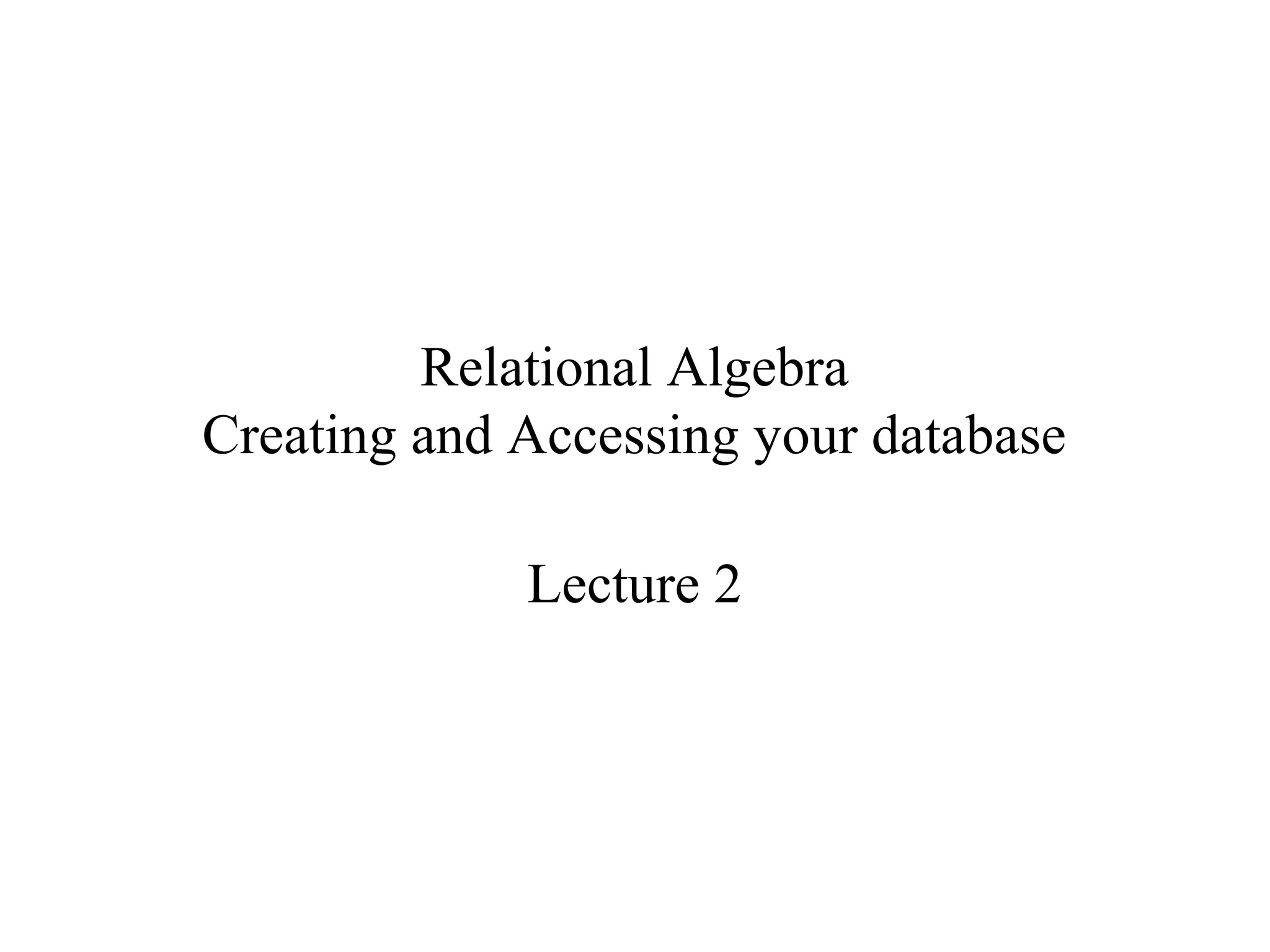The document discusses relational algebra and accessing MySQL databases. It covers fundamental relational algebra operations like selection, projection, union, set difference, and cartesian product. It also describes how to create tables in a MySQL database, submit SQL queries, and access the database from the command line. Basic concepts like relations, attributes, tuples, schemas, and keys are defined. Examples are provided to illustrate relational algebra operations.