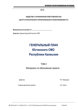 Документ представляет генеральный план развития юстинского сельского муниципального образования в республике Калмыкия, разработанный на основе множества нормативных и законодательных актов. В нем содержится анализ природных, демографических и экономических условий района, а также рекомендации по социально-экономическому развитию территории и улучшению инфраструктуры до 2032 года. План направлен на обеспечение согласованного развития муниципального образования, учитывая существующие ограничения и риски.