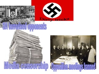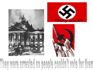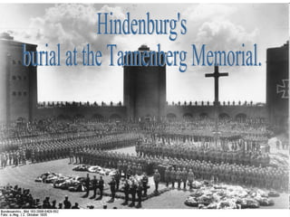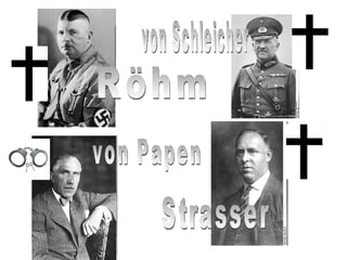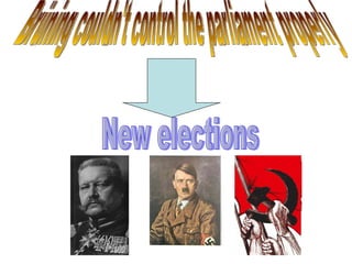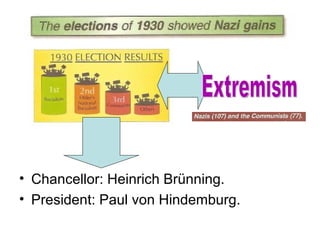 The document discusses the rise of dictators in Germany in the 1930s. It mentions key figures like Chancellor Heinrich Brünning and President Paul von Hindemburg ruling Germany as the nation struggled with the depression, rising communism, and failed disarmament. As democracy and the parliamentary system weakened, Adolf Hitler was eventually able to seize power as Chancellor and Führer.