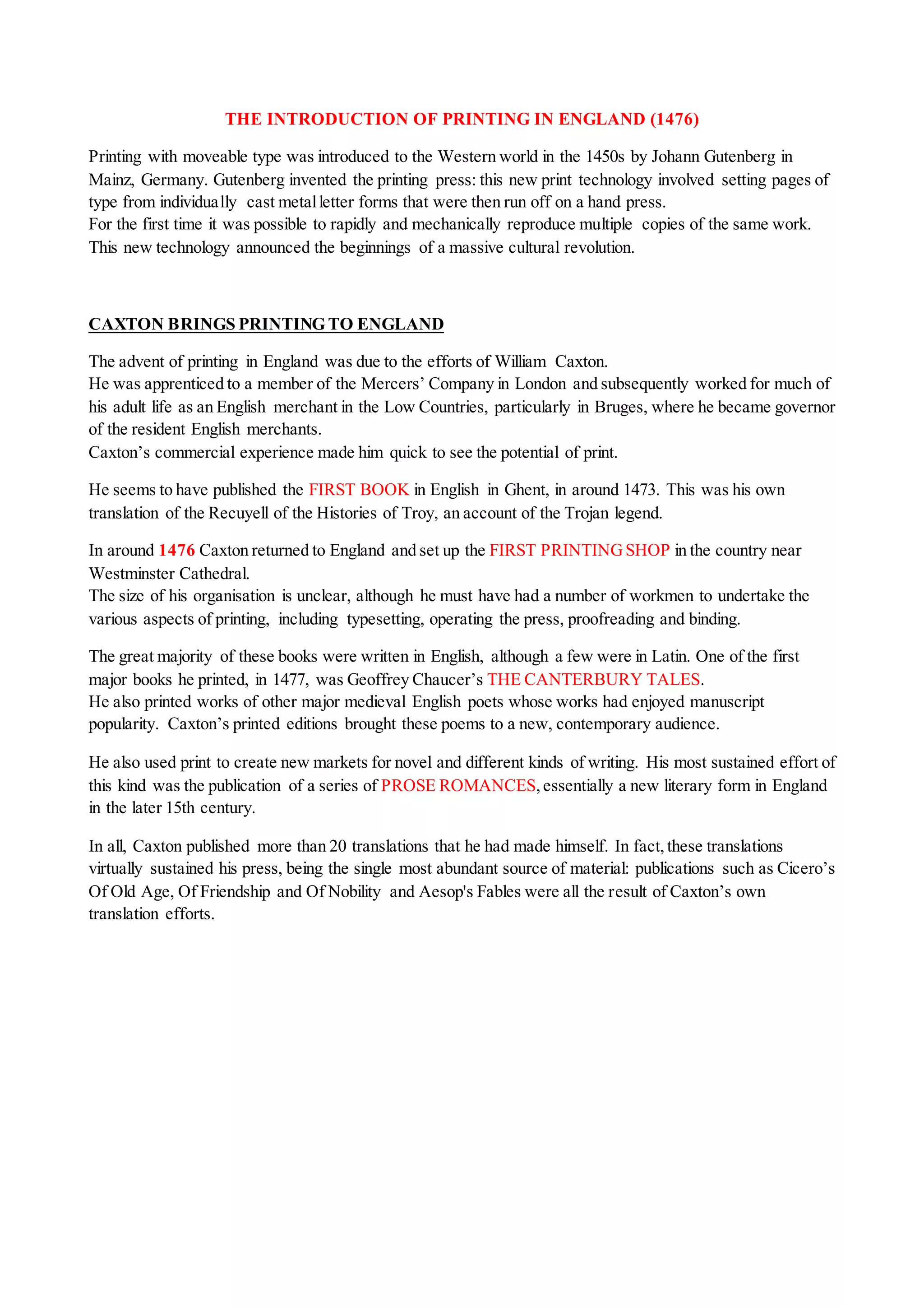 William Caxton introduced printing to England in 1476 by establishing the country's first printing press near Westminster Cathedral. Some of his earliest publications included Geoffrey Chaucer's The Canterbury Tales in 1477. Caxton helped popularize existing English works and create new markets by publishing prose romances and other texts. He played an important role as an editor and publicist, adding prefaces and epilogues to make his books more accessible to audiences. Caxton's printing efforts made important contributions to literacy and the development of the English language and book culture.