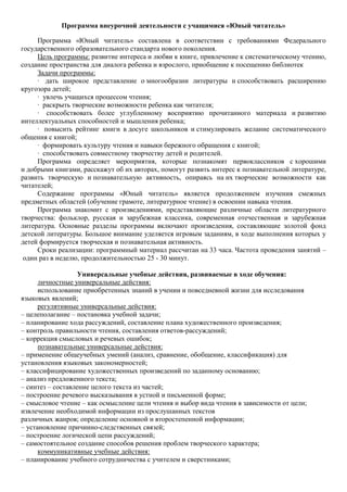 Программа внеурочной деятельности 'Юный читатель' направлена на развитие интереса к чтению среди школьников, особенно первоклассников, и включает мероприятия, способствующие углубленному восприятию литературы различных жанров. В ходе программы планируется развивать творческие и познавательные способности учеников через игровые задания и обсуждения произведений, а также формировать культуру чтения. Программа состоит из тематических занятий, проводимых один раз в неделю на протяжении 33 часов.