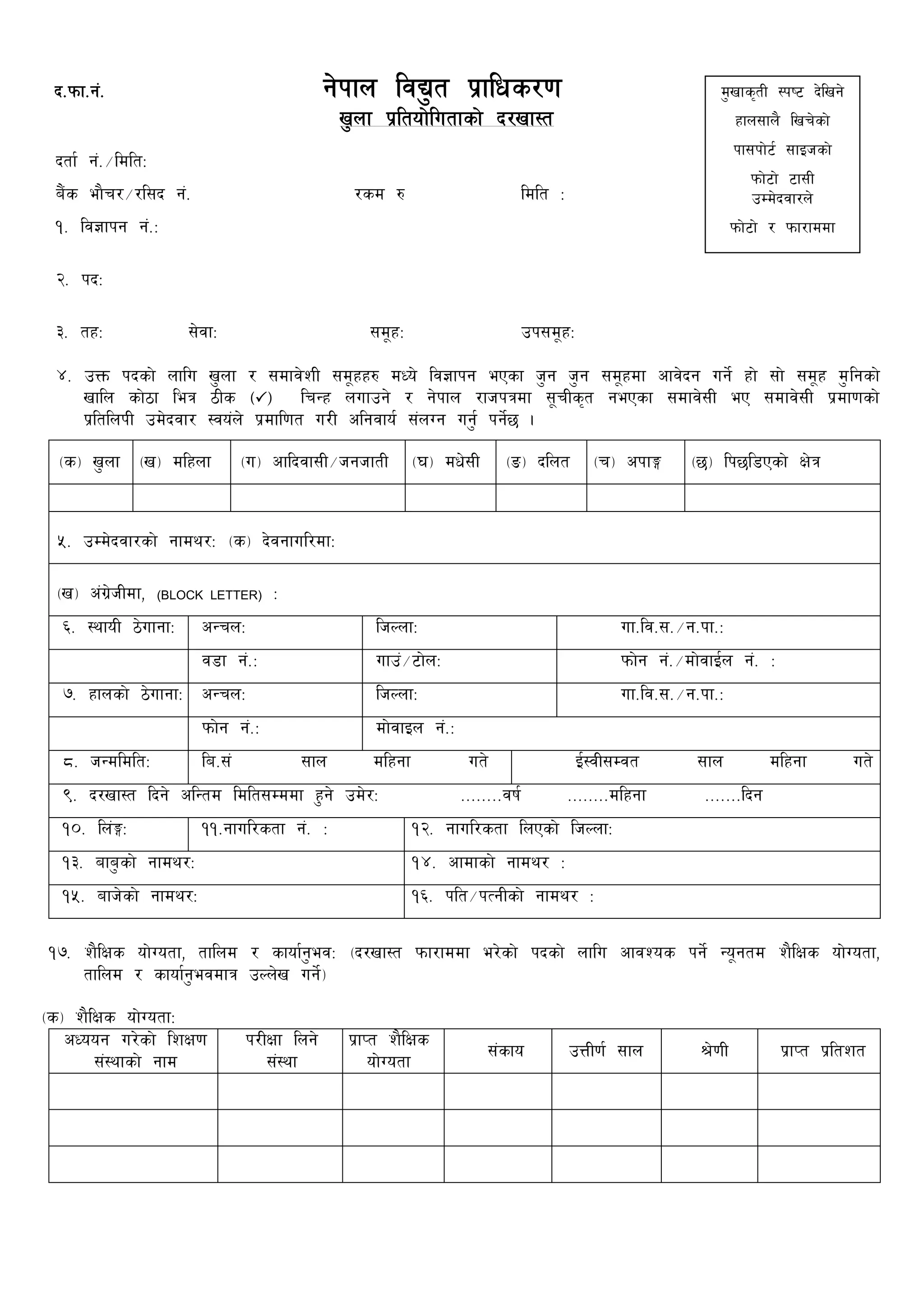 1. The document is an application form for an open competition position at Nepal Electricity Authority.