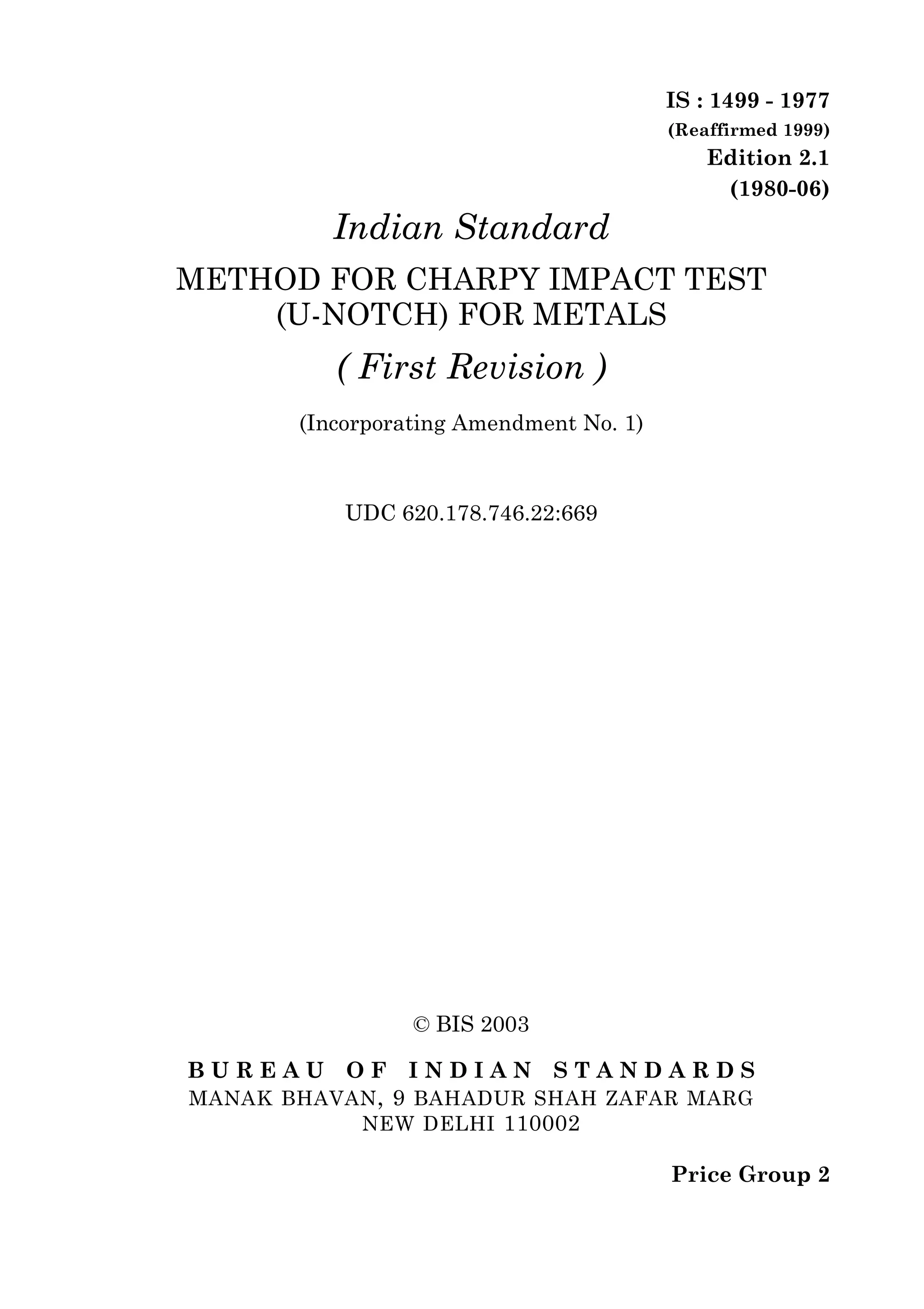 This document describes the Indian Standard method for conducting a Charpy impact test using a U-notch specimen for metals. It specifies the test machine requirements, including hammer speed, dimensions of the supports and hammer. It describes the standard 10x10mm test specimen and two subsidiary sizes, and gives tolerances for specimen dimensions. The procedure covers positioning and temperature of the test, with the standard being at 27°C ±2°C. Three specimens are to be tested and criteria for retests are given. Unbroken specimens are also addressed.