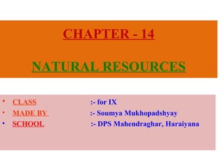 This document provides an overview of natural resources and biogeochemical cycles. It discusses the various natural resources found on Earth, including the atmosphere, hydrosphere, lithosphere and biosphere. It then goes into detail about specific natural resources like air, water, soil and living organisms. It also describes several important biogeochemical cycles like the water cycle, carbon cycle, nitrogen cycle and oxygen cycle. It concludes with brief discussions of the greenhouse effect and ozone layer.