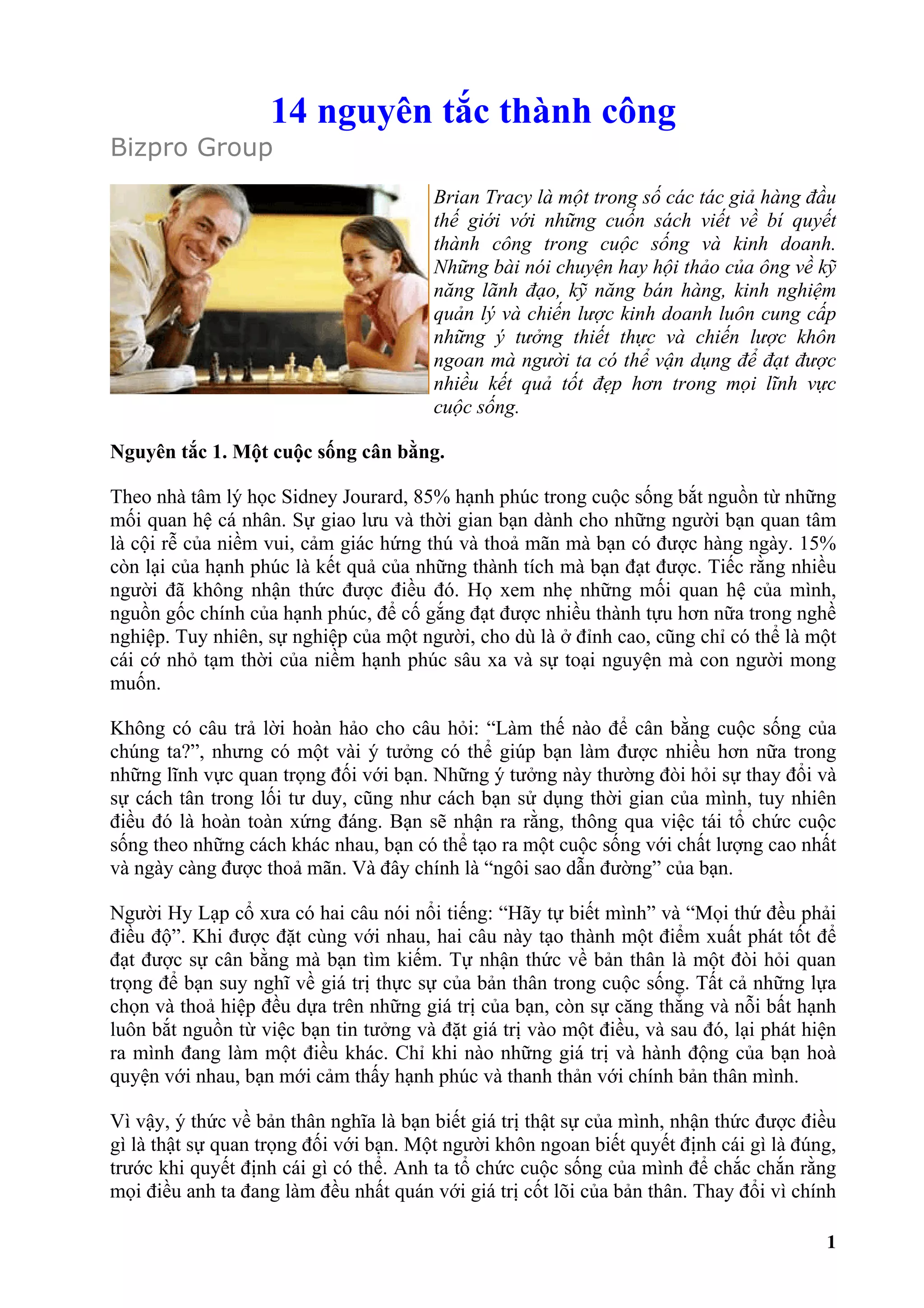 Tài liệu trình bày 14 nguyên tắc thành công của Brian Tracy, nhấn mạnh tầm quan trọng của việc duy trì sự cân bằng giữa công việc và cuộc sống cá nhân để đạt được hạnh phúc. Nguyên tắc đầu tiên nhấn mạnh giá trị của những mối quan hệ cá nhân và cách quản lý thời gian hiệu quả, trong khi nguyên tắc thứ hai tập trung vào việc xây dựng lòng tự trọng và sự trung thực trong hành động hàng ngày. Điều này không chỉ giúp đạt được thành công cá nhân mà còn tạo dựng được niềm tin và mối quan hệ tốt đẹp với người khác.