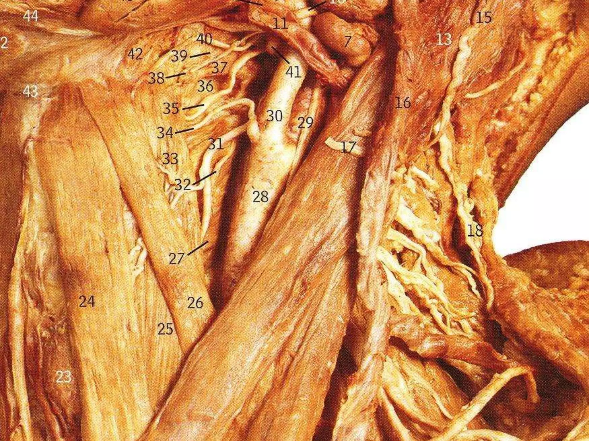 The anterior triangle of the neck contains three smaller triangles - the submandibular, submental, and muscular triangles. The submandibular triangle contains the submandibular gland and associated nerves and vessels, including the lingual and hypoglossal nerves. The submental triangle drains lymph from the chin and lower lip. The muscular triangle contains the infrahyoid strap muscles that depress the hyoid bone during swallowing.