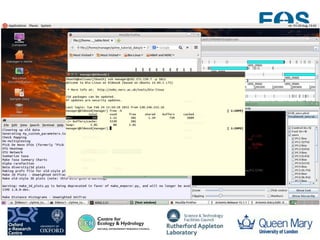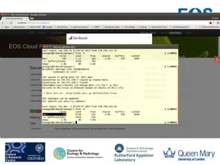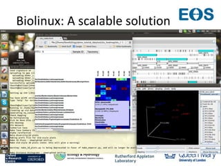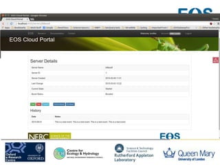 This document summarizes a desktop as a service solution called EOSCloud that provides scalable bioinformatics tools on the cloud. EOSCloud is a NERC Big Data project that gives researchers virtual machines with preinstalled bioinformatics software like Biolinux. Researchers are given two VMs - one with Biolinux and one Ubuntu Docker host. The VMs can be boosted to higher capabilities for more intensive tasks, consuming credits only for the boosted time. EOSCloud aims to make infrastructure more efficient and lower barriers to entry for researchers compared to traditional HPC or grid computing. A pilot launch is scheduled for March 31st, 2015 to test with early user communities.
