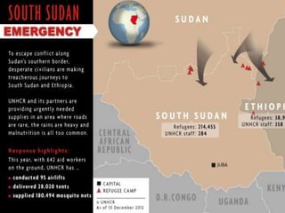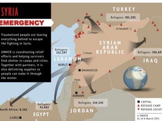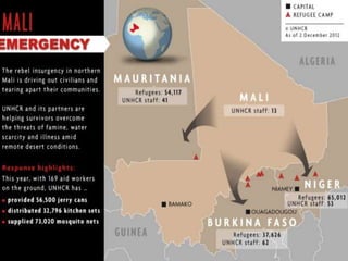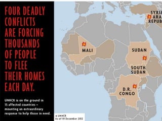 This document provides an overview of UNHCR (United Nations High Commissioner for Refugees) including: - UNHCR was established after WWII to respond to refugees in Europe. It currently assists refugees, asylum seekers, internally displaced persons, and stateless people. - UNHCR's mandate is to provide protection and seek durable solutions such as repatriation, resettlement, and local integration. - UNHCR faces challenges in accurately knowing refugee populations, assessing refugee needs, and sharing information with partners. Technology can help address these challenges.