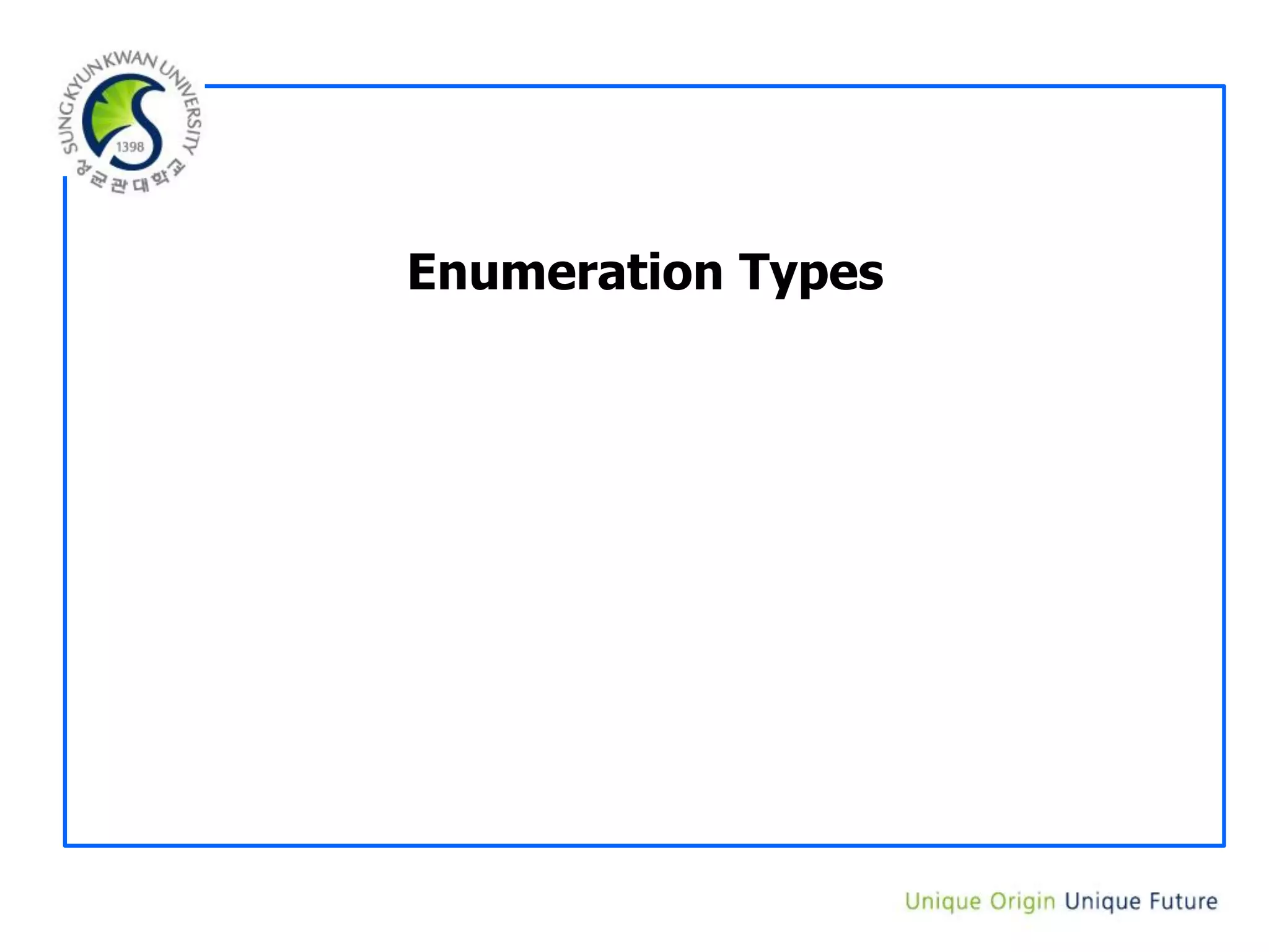 The document discusses enumeration types in C programming. Enumeration types allow defining symbolic constants to represent integer values. Several examples are provided to demonstrate defining enum types with symbolic names for colors like YELLOW, RED and BLUE. Enum variables can then be used in place of integer values in for loops and switch statements. Typedef is also shown to create alias names for enum types for improved readability and code organization.