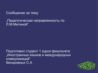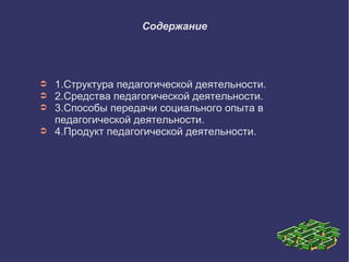 Документ описывает педагогическую направленность по Л.М. Митиной, включая структуру и средства педагогической деятельности, а также способы передачи социального опыта и продукт этой деятельности. Структура педагогической деятельности включает мотивацию, цели, средства и результаты. Продуктом является индивидуальный опыт ученика, который оценивается на экзаменах и зачетах.