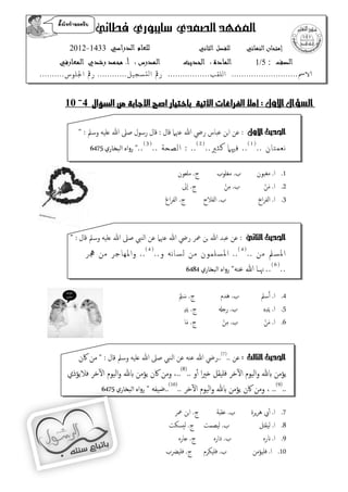 א אאل א אאل א א4−−−− 10 وﺳﲅ ﻠﻴﻪ ﷲ ﺻﲆ رﺳﻮل ﻗﺎل" : ير ا روا6475 وﺳﲅ ﻠﻴﻪ ﷲ ﺻﲆﻗﺎل" : ﳗﺮ ﻣﻦ واﳌﻬﺎﺟﺮ ﻗﺎل وﺳﲅ ﻠﻴﻪ ﷲ ﺻﲆ اﻟﻨﱯ ﻋﻦ ﻋﻨﻪ ﷲ رﴈ:"ﰷن ﻣﻦ ﻓﻼﻳﺆذي ﺧﺮٓ*ا اﻟﻴﻮمو ,- ﻳﺆﻣﻦ ﰷن وﻣﻦ ، ير ا روا6475 א א اﻟﺪراﺳﻲ1433-2012 .اﻟﻤﻌﺎرﻓﻲ رﺷﺪي ﻣﺤﻤﺪ ............اﳉﻠﻮس رﰴ.......... ตั้งใจทํานะครับ א א אא א אא א אא א אאل א אאل א אאل א אאل א א ول א אول א אول א אول א א:ﻗﺎل ﻋﳯﲈ ﷲ رﴈ ﻋﺒﺎس ا6ﻦ ﻋﻦ:وﺳﲅ ﻠﻴﻪ ﷲ ﺻﲆ رﺳﻮل ﻗﺎل 1( ..ﻛﺜﲑ ﻓﳱﲈ..)2( : ..اﻟﺼ@ﺔ..)3( .."ير ا روا ب.ﻣﻐﻠﻮبج.ﻣﻠﻌﻮن ْﻦَﻣب.ج ْﻦِﻣ.ٕﱃا اخﺮاﻟﻔب.ج اﻟﻔﻼح.اغﺮاﻟﻔ :ﻋﻦﲻﺮ 6ﻦ ﷲ ﻋﺒﺪﻋﳯﲈ ﷲ رﴈاﻟﻨﱯ ﻋﻦوﺳﲅ ﻠﻴﻪ ﷲ ﺻﲆ ..)4( ..و ﻟﺴﺎﻧﻪ ﻣﻦ اﳌﺴﻠﻤﻮن..)4( ..ﳗﺮ ﻣﻦ واﳌﻬﺎﺟﺮ ﻋﻨﻪ ﷲ ﺎVﳖ"ير ا روا6484 ب.ﻫﺪمج.َ ِﲅ َﺳ ب.YZرج.ٍﺪَﻳ ب.ْﻦِﻣج.ﺎَﻣ א אא אא אא אWﻋﻦ..)7( ..ﻗﺎل وﺳﲅ ﻠﻴﻪ ﷲ ﺻﲆ اﻟﻨﱯ ﻋﻦ ﻋﻨﻪ ﷲ رﴈ ؤ^ اﲑ_ ﻓﻠﻴﻘﻞ ﺧﺮٓ*ا اﻟﻴﻮمو ,- ﻳﺆﻣﻦ..)8( ..ﻓﻼﻳﺆذي ﺧﺮٓ*ا اﻟﻴﻮمو ,- ﻳﺆﻣﻦ ﰷن وﻣﻦ ، ﺧﺮٓ*ا اﻟﻴﻮمو ,- ﻳﺆﻣﻦ ﰷن وﻣﻦ ،..)10( ..ﺿﻴﻔﻪ"ير ا روا ب ﺮةfﺮﻫ ﰊٔ^.ﺔhﻋﻘج.ﲻﺮ 6ﻦا ب ﻞiﻟﻴﻘ.ج ﻟﻴﺼﻤﺖ.ﺴﻜﺖlﻟ ب رﻩn.ج دارﻩ.ﺎرﻩZ ب ﻓﻠﻴﺆﻣﻦ.ج ﻓﻠﻴﻜﺮم.ﻓﻠﻴﴬب א א اﻟﻨﻬﺎﺋﻲإﻣﺘﺤﺎنﻟﻠﻔﺼﻞاﻟﺜﺎﻧﻲﻟﻠﻌﺎماﻟﺪراﺳﻲ اﻟﻤﺎدة:اﻟﺤﺪﻳﺚاﻟﻤﺪرس:أ. ...........................ﻠﻘﺐrا.................ﺴﺠﻴﻞtﻟا رﰴ............ ول א אل אول א אل אول א אل אول א אل אWWWW ول א אول א אول א אول א א ﻧﻌﻤﺘﺎن..)1 1.ا.ﻣﻐﺒﻮن 2.ا.ْﻦَﻣ 3.ا.اخﺮاﻟﻔ א אא אא אא א ﻣﻦ اﳌﺴﲅ.. ..)6( ..ﻋﻨﻪ ﷲ ﺎVﳖ 4.ا.ﺳﲅw^ 5.ا.ِﻩِﺪَﻳ 6.ا.ْﻦَﻣ א אא אא אא א ؤ^ اﲑ_ ﻓﻠﻴﻘﻞ ﺧﺮٓ*ا اﻟﻴﻮمو ,- ﻳﺆﻣﻦ ..)9( ..ﺧﺮٓ*ا اﻟﻴﻮمو ,- ﻳﺆﻣﻦ ﰷن وﻣﻦ ، 7.ا.ب ﺮةfﺮﻫ ﰊٔ^ 8.ا.ب ﻞiﻟﻴﻘ 9.ا.ب رﻩn 10.ا.ب ﻓﻠﻴﺆﻣﻦ א א اﻟﻨﻬﺎﺋﻲإﻣﺘﺤﺎن 1/5 : اﻟﺼﻒ {ﰟ...........................