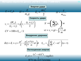 Документ содержит методику обработки результатов испытаний ударостойкости композитных материалов, включая формулы расчета энергии удара и характеристики повреждений в зависимости от уровня энергии удара. Приведены данные о проведенных экспериментах с различными образцами сотовых панелей, их характеристиками и типами повреждений. Также документ включает экспериментальные данные о нагрузке, времени и поглощенной энергии.