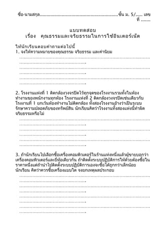 เลข ที่ ....... แบบทดสอบ เรื่อง คุณธรรมและจริยธรรมในการใช้อินเตอร์เน็ต ให้นักเรียนตอบคำาถามต่อไปนี้ 1. จงให้ความหมายของคุณธรรม จริยธรรม และค่านิยม ……………………………………………………………………………… ………………………………………. ……………………………………………………………………………… ………………………………………. ……………………………………………………………………………… ………………………………………. 2. โรงงานแห่งที่ 1 ติดกล้องวงจรปิดไว้ทุกจุดของโรงงานรวมทั้งในห้อง ทำางานของพนักงานทุกห้อง โรงงานแห่งที่ 2 ติดกล้องวงจรปิดเช่นเดียวกับ โรงงานที่ 1 ยกเว้นห้องทำางานไม่ติดกล้อง ทั้งสองโรงงานอ้างว่าเป็นระบบ รักษาความปลอดภัยของทรัพย์สิน นักเรียนคิดว่าโรงงานทั้งสองแห่งนี้ทำาผิด จริยธรรมหรือไม่ ……………………………………………………………………………… ………………………………………. ……………………………………………………………………………… ………………………………………. ……………………………………………………………………………… ………………………………………. 3. ถ้านักเรียนไปเลือกซื้อเครื่องคอมพิวเตอร์ในร้านแห่งหนึ่งแล้วผู้ขายบอกว่า เครื่องคอมพิวเตอร์และยี่ห้อเดียวกัน ถ้าติดตั้งระบบปฏิบัติการให้ด้วยต้องซื้อใน ราคาหนึ่งแต่ถ้านำาไปติดตั้งระบบปฏิบัติการเองจะซื้อได้ถูกกว่าเล็กน้อย นักเรียน คิดว่าควรซื้อเครื่องแบบใด จงยกเหตุผลประกอบ ……………………………………………………………………………… ………………………………………. ……………………………………………………………………………… ………………………………………. ……………………………………………………………………………… ………………………………………. ……………………………………………………………………………… ……………………………………….