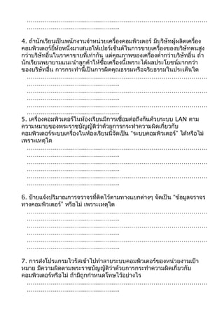 ………………………………………. ……………………………………………………………………………… ………………………………………. ……………………………………………………………………………… ………………………………………. 8. ถ้านักเรียนแกล้งเพื่อนโดยส่งอีเมล์จำานวนมากเข้าไปในเครื่องคอมพิวเตอร์ ของเพื่อนอย่างต่อเนื่องจนเครื่องนั้นทำางานช้าลงอย่างมาก นักเรียนคิดว่าการ กระทำานี้มีความผิดหรือไม่ ……………………………………………………………………………… ………………………………………. ……………………………………………………………………………… ………………………………………. ……………………………………………………………………………… ………………………………………. 9. ถ้านักเรียนส่งไวรัสม้าโทรจันไปดักจับข้อมูลการทำาธุรกรรมอิเล็กทรอนิกส์ ของผู้อื่นเพื่อให้ได้มาซึ่งข้อมูลที่เป็นประโยชน์กับนักเรียนเอง จะมีความผิดตาม มาตราใด ……………………………………………………………………………… ………………………………………. ……………………………………………………………………………… ………………………………………. ……………………………………………………………………………… ………………………………………. 10. เหตุใดจึงต้องมีพระราชบัญญัติว่าด้วยการกระทำาความผิดเกี่ยวกับ คอมพิวเตอร์ออกมาบังคับใช้ ……………………………………………………………………………… ………………………………………. ……………………………………………………………………………… ………………………………………. ……………………………………………………………………………… ……………………………………….