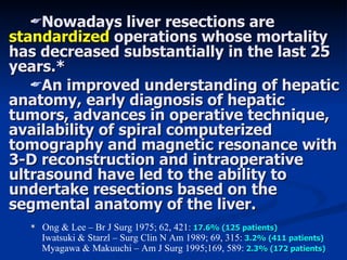 The document discusses segment oriented liver resections. It describes how improved imaging and surgical techniques have enabled more precise resections based on the liver's segmental anatomy. Various types of segmental resections are outlined, including segmentectomies, bisegmentectomies, and trisegmentectomies. Indications for these procedures include benign lesions, cirrhosis, multiple lesions, and liver metastases. Postoperative morbidity and mortality rates are reported to be minimal.