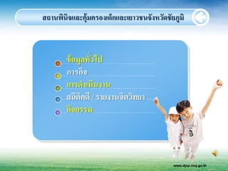 ้ สถานพินิจฯ ไม่ ใช่ “คุกเด็ก” แต่ คอ ื “ทีพกพิงชั่วคราวหรือชุมชนของเด็กทีก้าวพลาด” ่ ั ่ ทีให้ ท้งความรู้และวิชาชีพ ่ ั แก่เด็กและเยาวชนติดตัวในอนาคต และเป็ นเด็กดีกลับคืนสู่ สังคม www.djop.moj.go.th