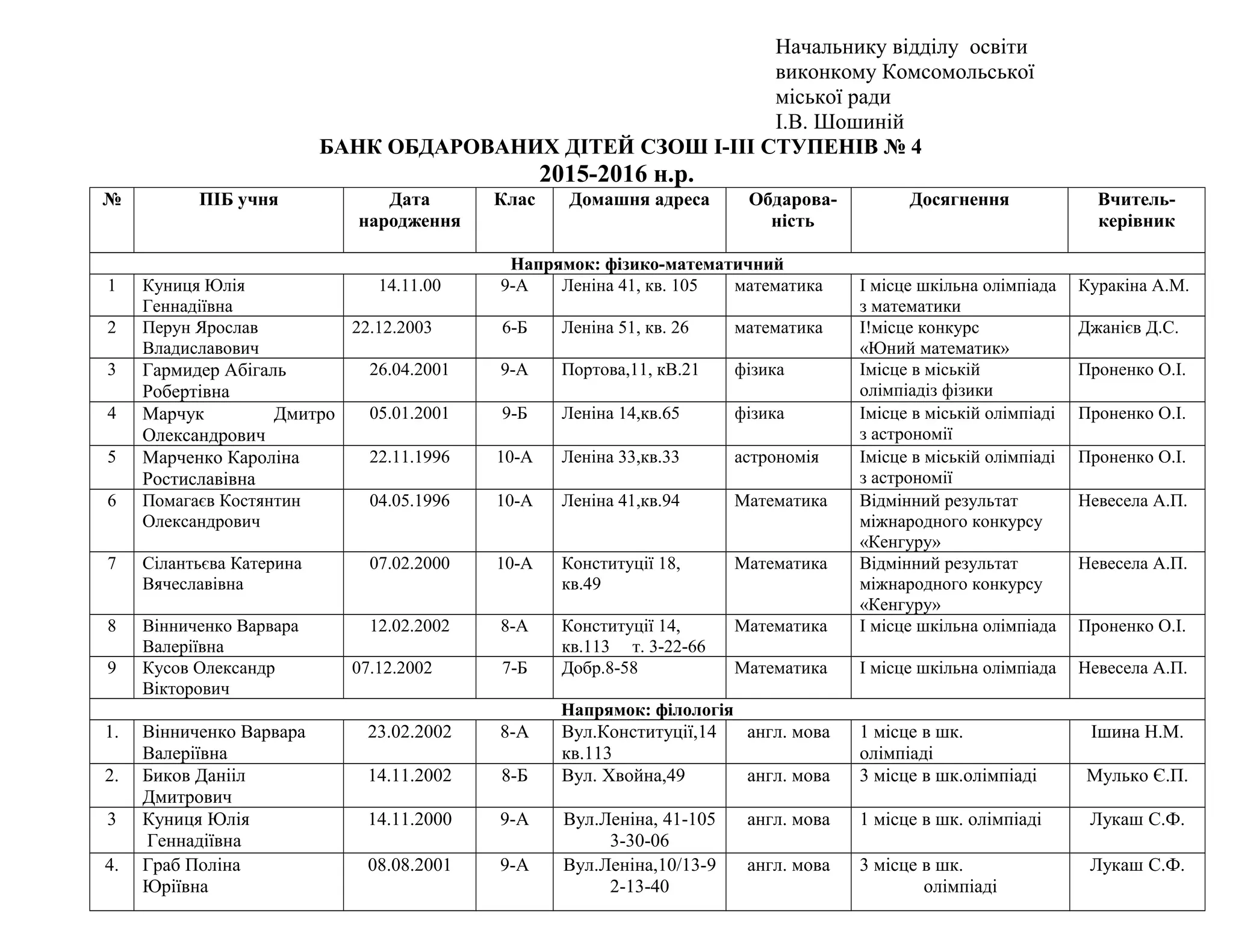 БАНК ОБДАРОВАНИХ ДІТЕЙ СЗОШ І-ІІІ СТУПЕНІВ № 4