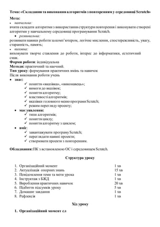 Тема:«Складаннята виконанняалгоритмівз повторенняму середовищі Scratch»