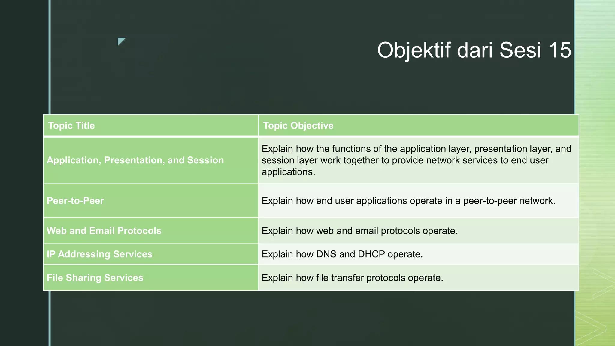 The document covers the functions of the application, presentation, and session layers of the OSI model, detailing how these layers provide network services to end-user applications. It explains various protocols for web communications like HTTP/HTTPS, email protocols, and IP addressing services such as DNS and DHCP, along with file transfer protocols like FTP and SMB. Additionally, it discusses the differences between client-server and peer-to-peer models and highlights the key roles of these protocols in automating networking tasks and enabling resource sharing.