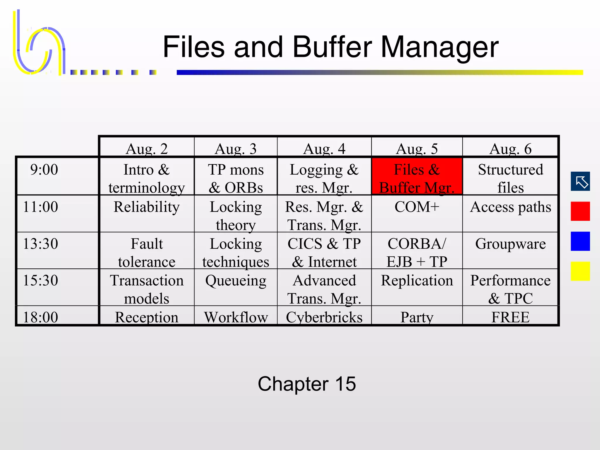 This document discusses the file and buffer manager components of a database system. It describes how the file manager provides abstractions like device, allocation, and address independence. It also explains how the buffer manager caches data from external storage in main memory using techniques like logging, locking, and checkpointing to ensure data integrity and concurrency control during transaction processing. Key aspects of the buffer manager covered include its interface, replacement policies, and how it supports recovery through logging and maintaining page-level write-ahead logs.