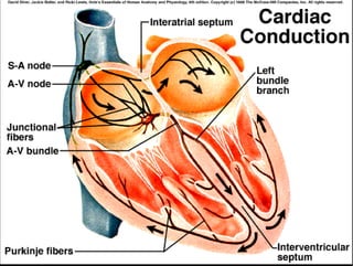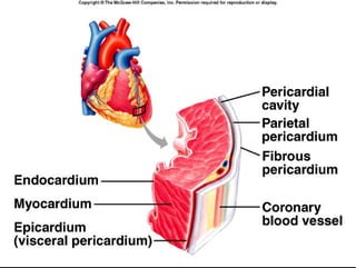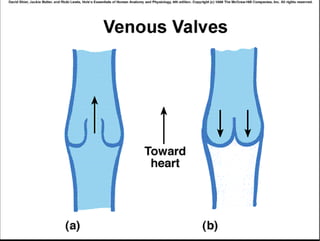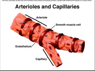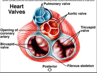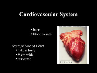 The document summarizes key aspects of the cardiovascular system. It describes the anatomy of the heart, including the four chambers and major valves. It explains that deoxygenated blood enters the right side of the heart and is pumped to the lungs, while oxygenated blood enters the left side and is pumped out to the body. It also discusses regulation of blood flow and pressure through the heart cycle and autonomic nervous system.