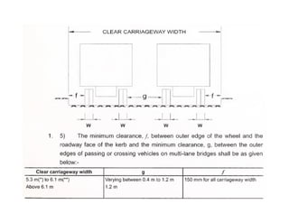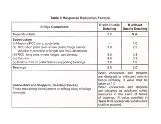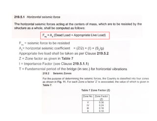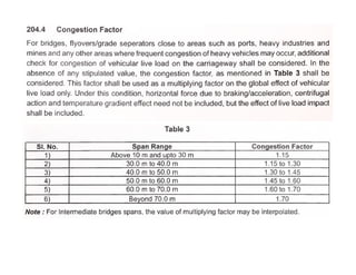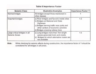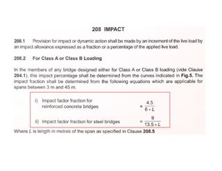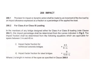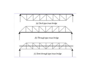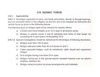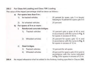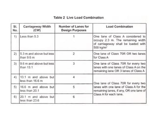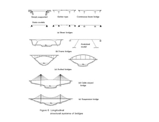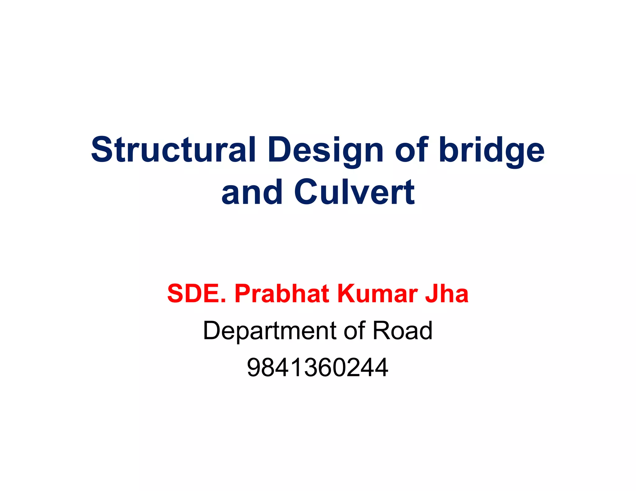 This document discusses structural design considerations for bridges and culverts. It covers types of bridges selected based on span length and economics. It also discusses loads on bridges including dead load, live load, impact load, wind load, and other factors. The document provides details on solid slab bridges, girder bridges, and truss bridges. It also covers design of box culverts.
