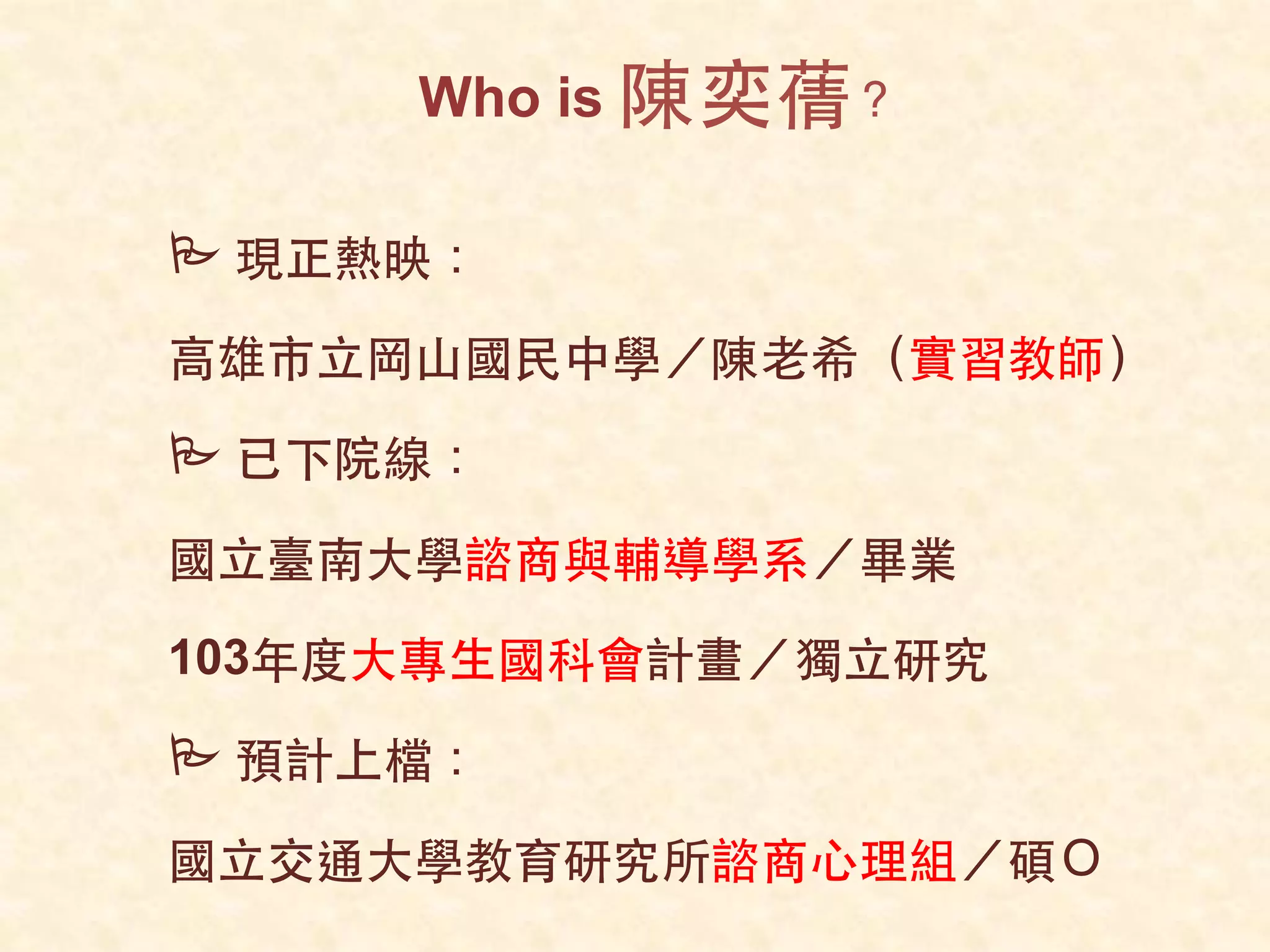 P 現正熱映: ⾼高雄市⽴立岡⼭山國⺠民中學/陳⽼老希(實習教師) P 已下院線: 國⽴立臺南⼤大學諮商與輔導學系/畢業 103年度⼤大專⽣生國科會計畫/獨⽴立研究 P 預計上檔: 國⽴立交通⼤大學教育研究所諮商⼼心理組/碩O