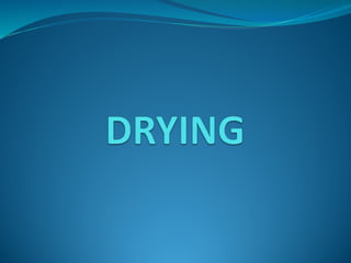 This document provides an overview of drying in the pharmaceutical industry. It discusses the importance of drying as the last stage of manufacturing before packaging. The key types of drying covered are convective, conductive, and radiative drying. Convective drying can be static bed or dynamic fluidized bed. Conductive drying uses vacuum ovens or tumblers. Radiative drying includes infrared and microwave radiation. Factors that influence drying like moisture content, bound vs unbound water, and equilibrium moisture content are also explained.