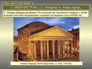 2. ARQUITECTURA. 2.3.-Religiosa. b.- Panteó Agripa. TEMA ART CLÀSSIC ROMÀ C.- Panteó d’Agripa de Roma És l’excepció de l’arquitectura religiosa i, també, el temple romà més impressionant i important (el tractarem com a FITXA 15 ). Panteó d’Agripa, Roma (Apol·lodor, s. II dC, 118-125).