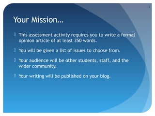 The document outlines an assessment activity for Year 11 students to write a formal opinion article on a chosen issue, aiming to enhance their writing skills and encourage public sharing of their ideas on a blog. It emphasizes learning the conventions of formal writing, structuring ideas, and developing content that is engaging and scannable for readers. The process includes research, collaboration, drafting, editing, and reflection to improve their writing and understand its impact.