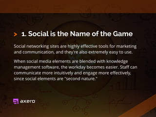 The document outlines 15 key trends in knowledge management, emphasizing the integration of social media, enhanced search indexing, and improved collaboration features. It highlights the importance of mobile accessibility, visual navigation, and user engagement, while also addressing the need for customizable, scalable software solutions that include customer support and automatic updates. Overall, these trends point towards a more interactive and user-friendly approach to managing organizational knowledge.