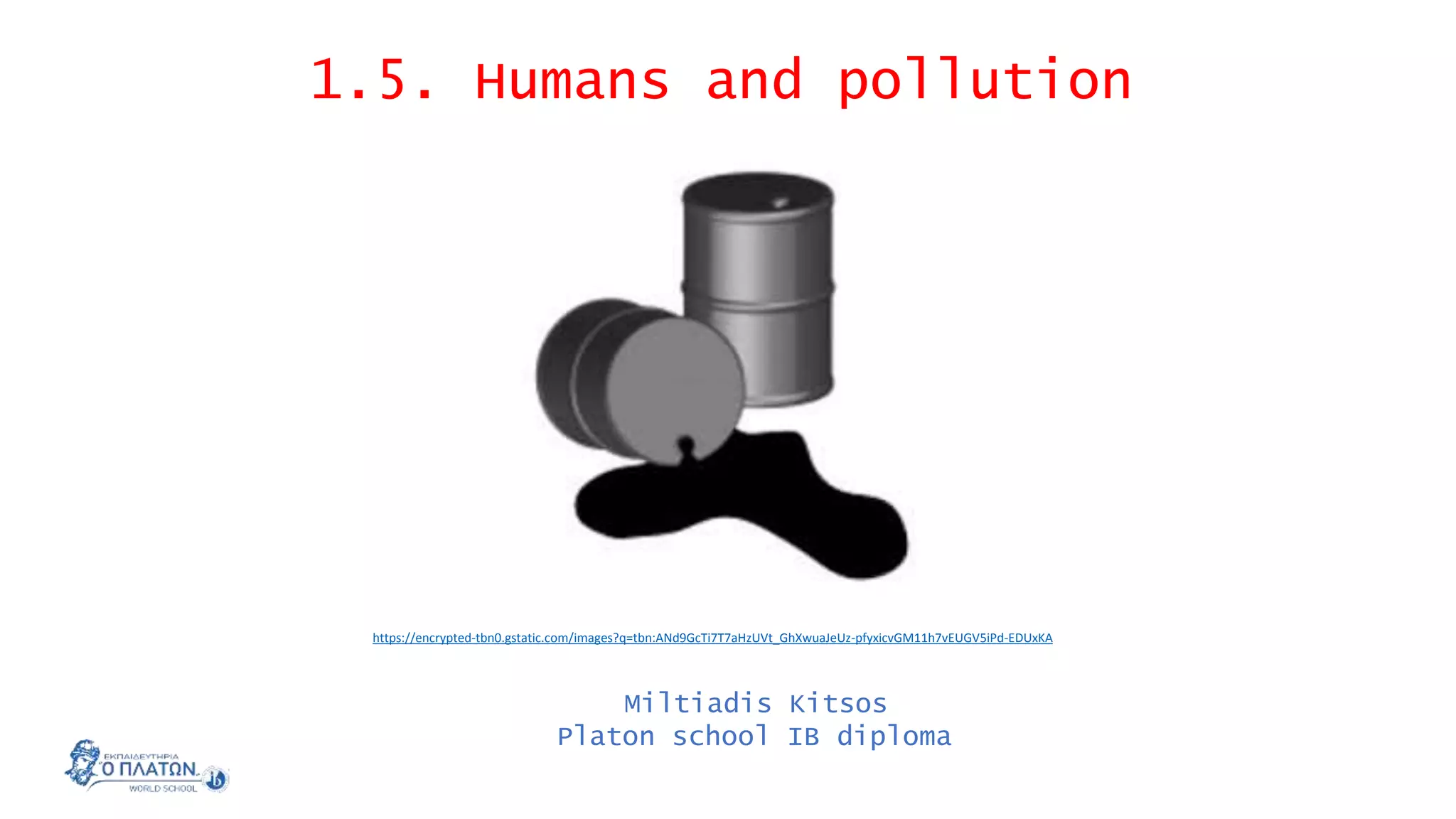 1. The document discusses various types of pollution caused by human activities and their impacts. It defines pollution and describes different forms such as air pollution, light pollution, and point source versus non-point source pollution.