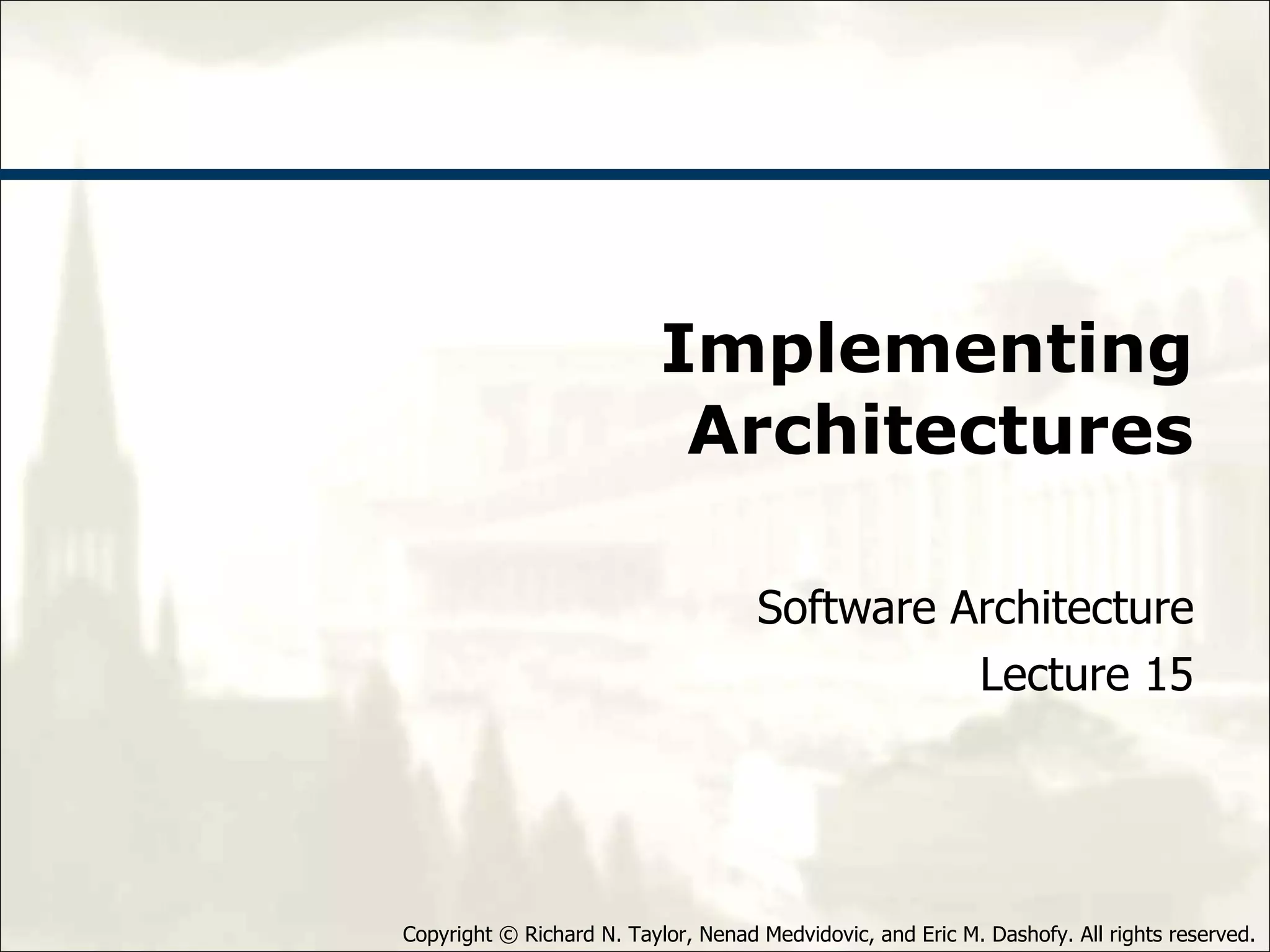 The document discusses architecture implementation frameworks. It defines an architecture implementation framework as a piece of software that bridges an architectural style to implementation technologies. It provides examples of different frameworks for supporting the pipe-and-filter and C2 styles. Frameworks can be evaluated based on properties like platform support, fidelity to style, assumptions, and efficiency. Middleware and component models are related but emerge based on services rather than style. Strategies for resolving mismatches between style and middleware are discussed.