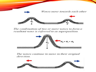 The document discusses the principles of interference and superposition of waves. It begins by explaining that when two or more waves meet at a point, the resultant displacement is the sum of the individual wave displacements. It then describes experiments investigating the interference patterns produced by water waves with varying wavelengths and distances between sources. The key findings are that the distance between nodes/antinodes increases with wavelength and decreases with source separation. The document concludes by explaining Young's double-slit experiment, which demonstrated interference of light waves.