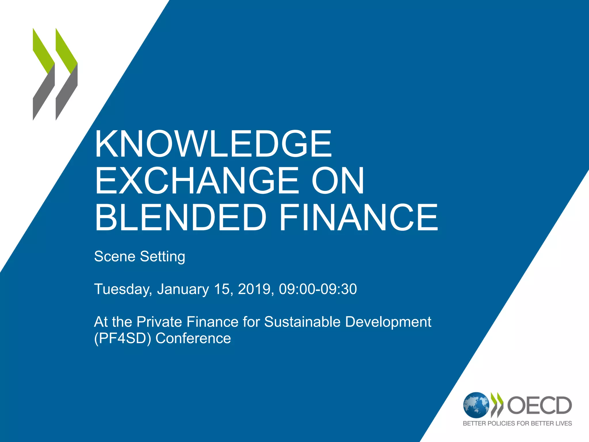 The document discusses blended finance, which is the strategic use of development finance to mobilize additional private finance for sustainable development projects. It provides the OECD's definition of blended finance and outlines its Blended Finance Principles. The OECD is working to enable development cooperation through facilitating transparency, evidence, and best practices related to mobilizing commercial finance using blended finance. It discusses building an evidence base around blended finance through data collection and reports. Key frameworks that guide the OECD's work on blended finance are also mentioned, including aligning investments with development priorities and the SDGs.