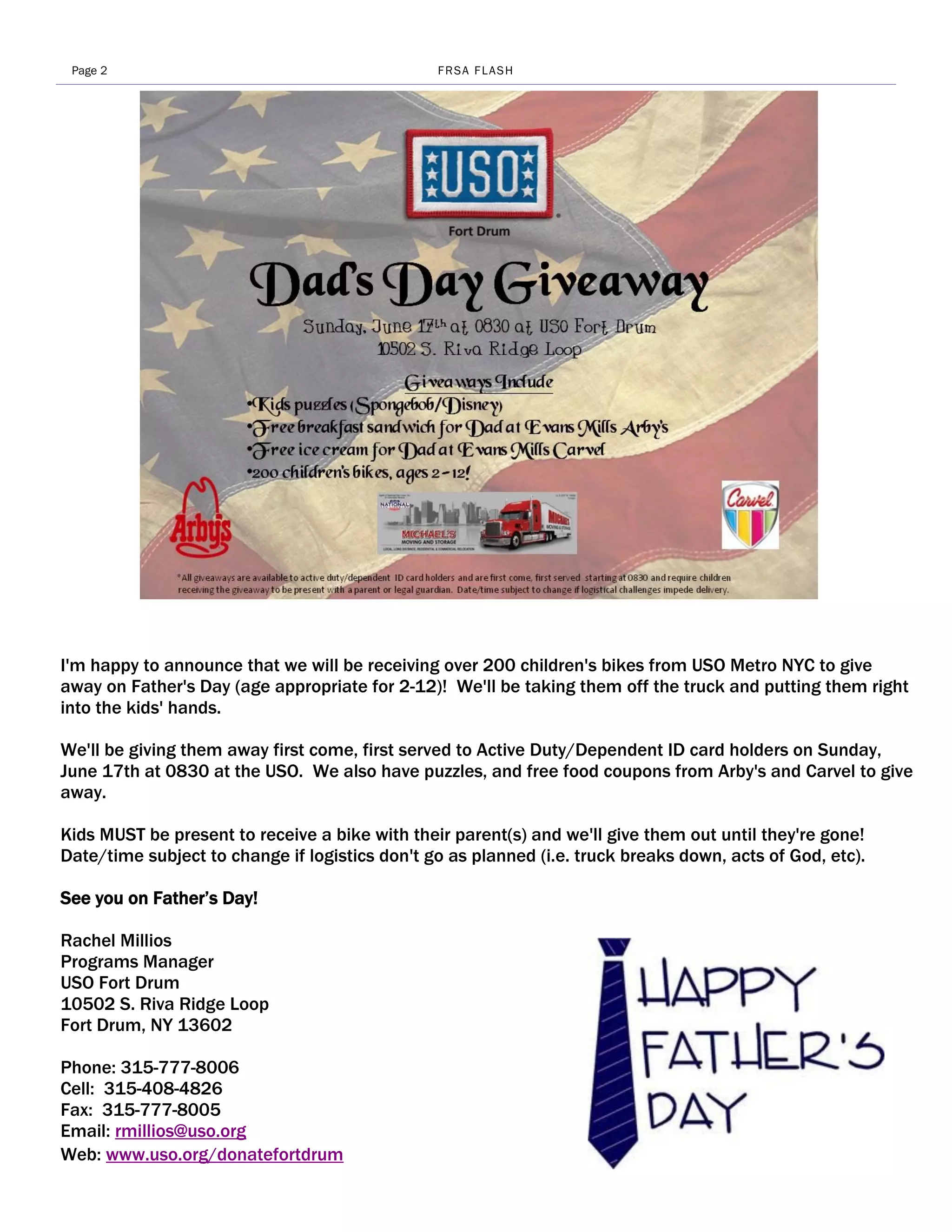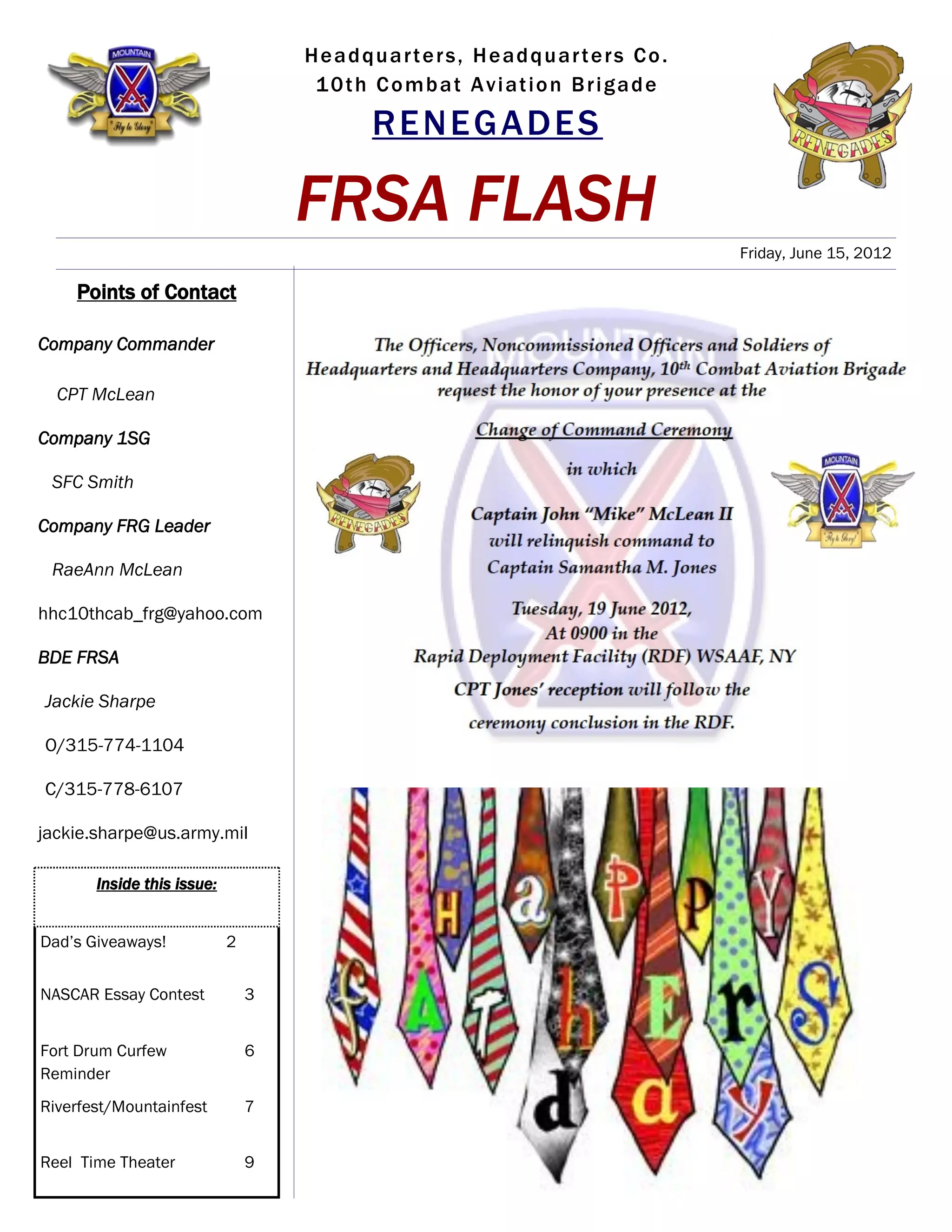This newsletter provides information for families of the 10th Combat Aviation Brigade at Fort Drum. It announces giveaways of bikes and food for Father's Day, summer youth employment programs, registration for a river race, changes to clinic hours, baseball camps, and security reporting. It also lists upcoming family events and movies at the post theater.