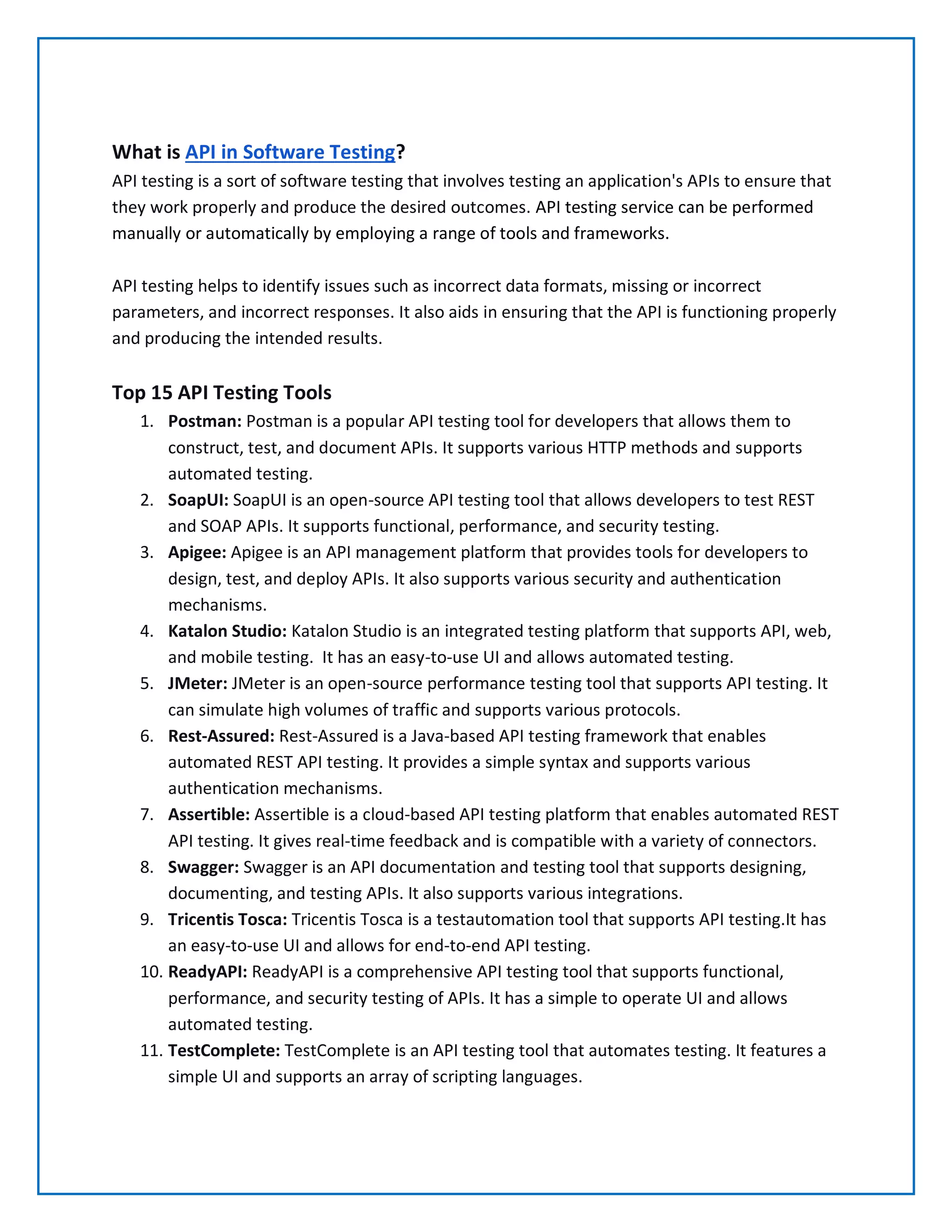 The document discusses the importance of API testing in software development and highlights 15 leading API testing tools for 2023, including Postman, SoapUI, and Apigee. Key features of APIs such as interoperability, reusability, and security are explained, emphasizing the role of API testing in identifying issues and ensuring proper functionality. The selection of an appropriate API testing tool depends on factors like testing requirements, cost, and automation needs.