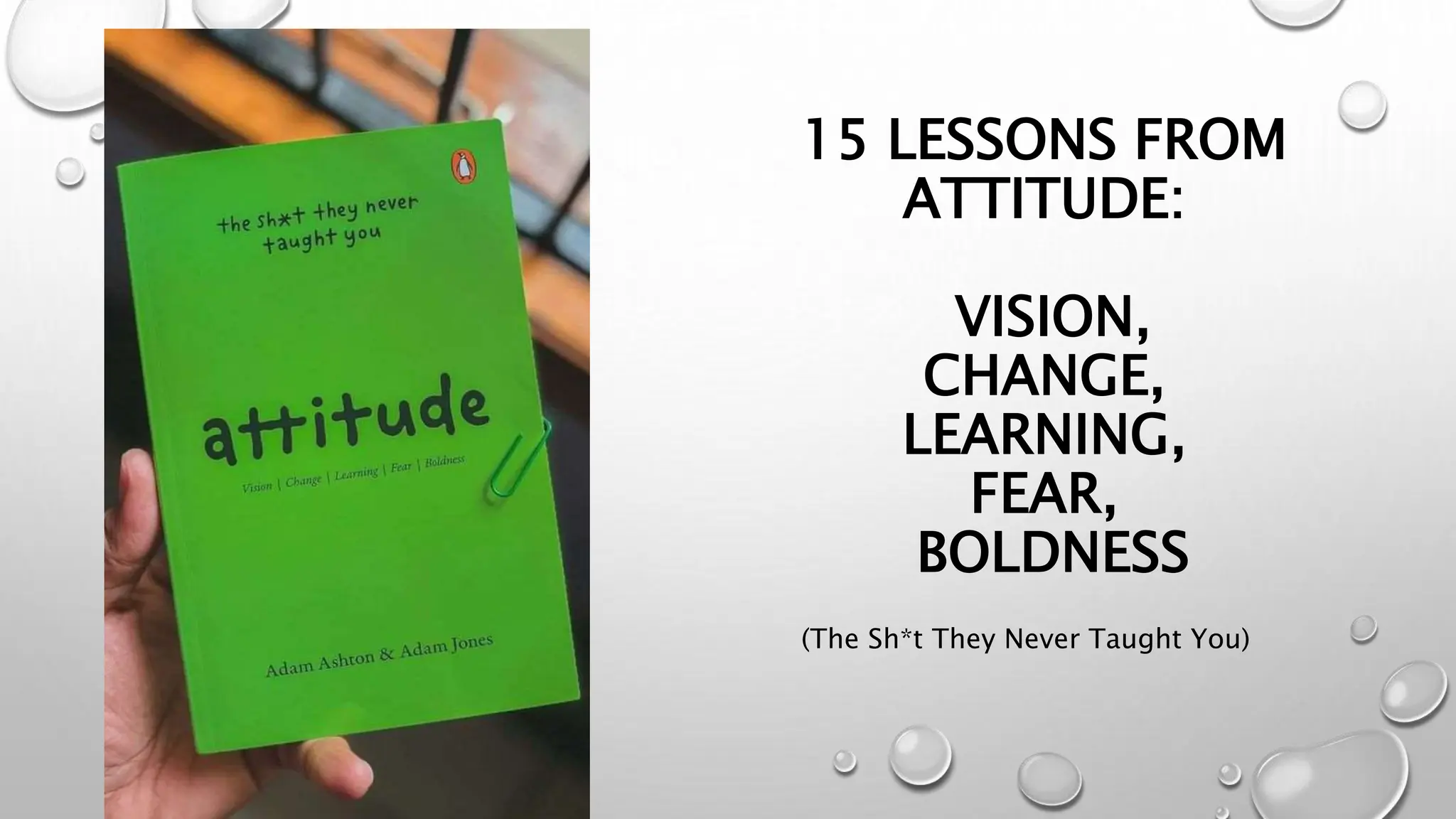 The document outlines 15 lessons on developing a positive attitude through vision, embracing change, and cultivating boldness. The key lessons are: 1) define clear goals and visions to guide decisions; 2) embrace change as an opportunity for growth; and 3) continuously learn new skills and knowledge to adapt to changes.