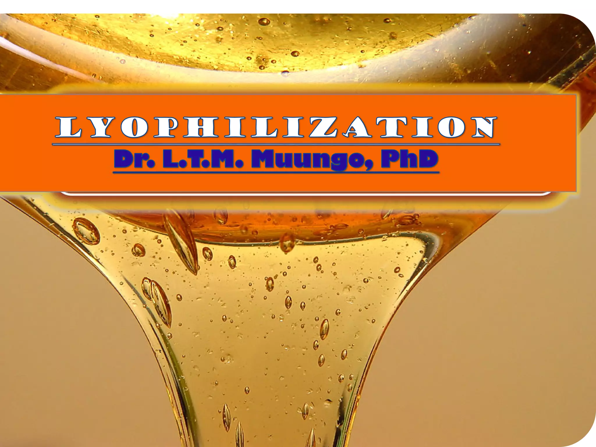 Lyophilization, also known as freeze drying, is a process used to remove water from materials while preserving their structure. It involves freezing the material and then reducing pressure to allow the frozen water to sublimate from the solid to gas phase. The process is carried out below the triple point of water to enable sublimation of ice. Freeze drying has applications in the food and pharmaceutical industries as it can preserve thermolabile compounds and materials by removing water while retaining quality.