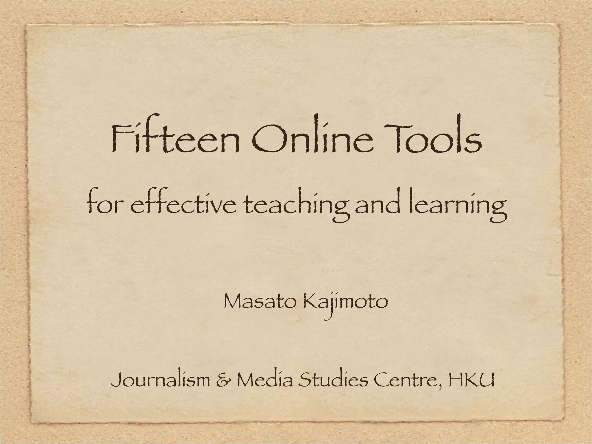 This document outlines 15 online tools for effective teaching and learning, grouping them into sharing resources, sharing through RSS, sharing collaboratively through Twitter and other tools, sharing files through services like Dropbox, and production tools including tools for slide presentations, multimedia, cooperation, word clouds, and data visualization.