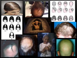 Alopecia, also known as baldness, refers to hair loss in areas of skin that normally have hair. There are two forms: scarring and non-scarring. Symptoms depend on the type of hair loss, and can include patches of hair loss, thinning hair, or hair falling out. Dental infections have been linked to alopecia, with bald patches sometimes appearing in areas corresponding to tooth infections. Alopecia is classified as a multifactorial genetic trait influenced by multiple genes and environmental factors. Genome mapping has linked alopecia to several chromosomes, including linkage to chromosome 18 in one study.
