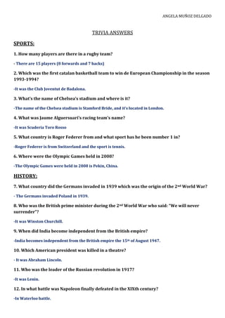 There are 15 players on a rugby team consisting of 8 forwards and 7 backs. The Club Joventut de Badalona was the first Catalan basketball team to win the European Championship in the 1993-1994 season. Chelsea's stadium is called Stamford Bridge and is located in London. Jaume Alguersuari's racing team was called Scuderia Toro Rosso. Roger Federer is from Switzerland and has been number 1 in tennis. The 2008 Olympic Games were held in Beijing, China.