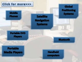 This document discusses several types of portable communication devices including mobile phones, portable DVD players, portable media players, global positioning systems, satellite navigation systems, handheld computers, and Bluetooth. It provides brief descriptions of how each device works and lists their main advantages and disadvantages.