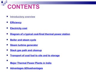 This document provides an overview of thermal power plants. It discusses the basic process of using steam to spin a turbine and generate electricity. Key components include the boiler, steam turbine, generator, and stack to remove gases. Efficiency is typically 33-48% with the rest of the energy exiting as waste heat. Thermal plants have relatively low initial costs but higher operating expenses than hydroelectric dams. The main disadvantages are air pollution and greenhouse gas emissions from burning fossil fuels.