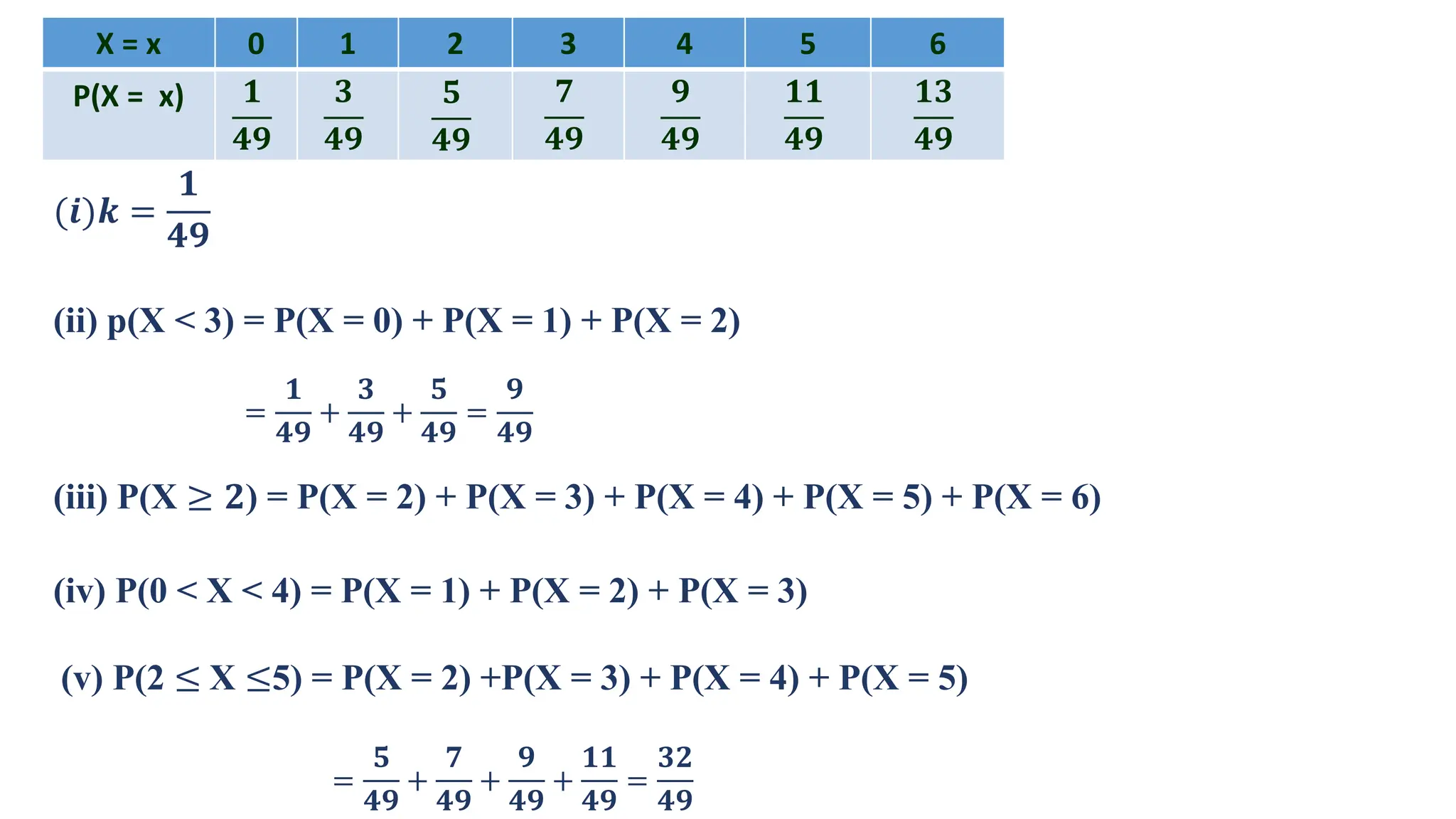 The document contains a series of examples related to probability distributions, including calculations of probabilities, expected values, variances, and standard deviations for various discrete random variables. It demonstrates how to derive parameters using given probability mass functions (pmfs) and probability density functions (pdfs). Additionally, it provides insights into calculating cumulative distributions and summaries of statistical properties for random variables.