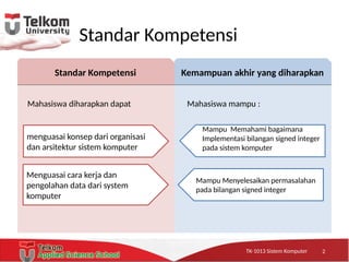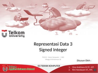 Dokumen tersebut membahas tentang representasi bilangan bertanda pada sistem komputer, yang mencakup empat teknik representasi bilangan bertanda yaitu sign magnitude, one's complement, two's complement, dan binary coded decimal. Dokumen ini juga menjelaskan operasi aritmatika pada masing-masing teknik representasi bilangan bertanda tersebut.