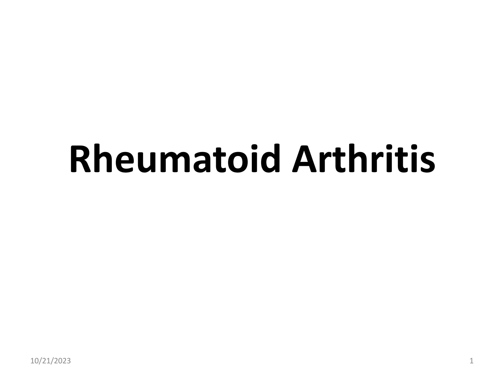 Rheumatoid Arthritis is a chronic autoimmune disease that causes inflammation of the joints and surrounding tissues. It is characterized by symmetric polyarticular joint involvement and can also affect other body systems. Early, aggressive treatment is important to slow disease progression and prevent joint damage. Treatment involves medications like DMARDs and biologics to reduce inflammation and slow joint destruction, with the goal of achieving remission and preserving joint function.