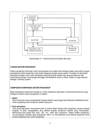 Dokumen ini menerangkan tentang sistem penghidup kenderaan, yang berfungsi untuk menyediakan tenaga mekanikal yang tinggi bagi menghidupkan enjin. Ia menjelaskan komponen utama sistem penghidup termasuk bateri, suis penyalaan, motor penghidup, dan solenoid, serta memberikan gambaran tentang operasi dan cabaran dalam memastikan enjin dapat dihidupkan dalam pelbagai keadaan cuaca. Kesimpulan menegaskan bahawa sistem penghidup adalah kritikal bagi fungsi enjin, tanpa yang mana enjin sukar untuk dihidupkan.