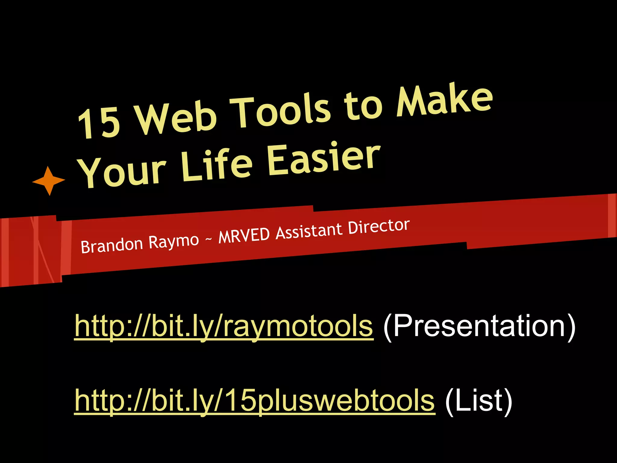 The document provides an overview of 15 web tools to make life easier including Screencast-o-Matic, Diigo, WeVideo, TubeChop, Print What You Like, Infuse Learning, Jing, Videonot.es, Livebinders, Jog the Web, IFTTT, Bit.ly, Google Analytics, StickIt, and Join.Me. Each tool is briefly described and potential educational uses are suggested. The agenda includes seeing and hearing about the tools, exploring and trying them, asking questions, and sharing other tools. [/SUMMARY]